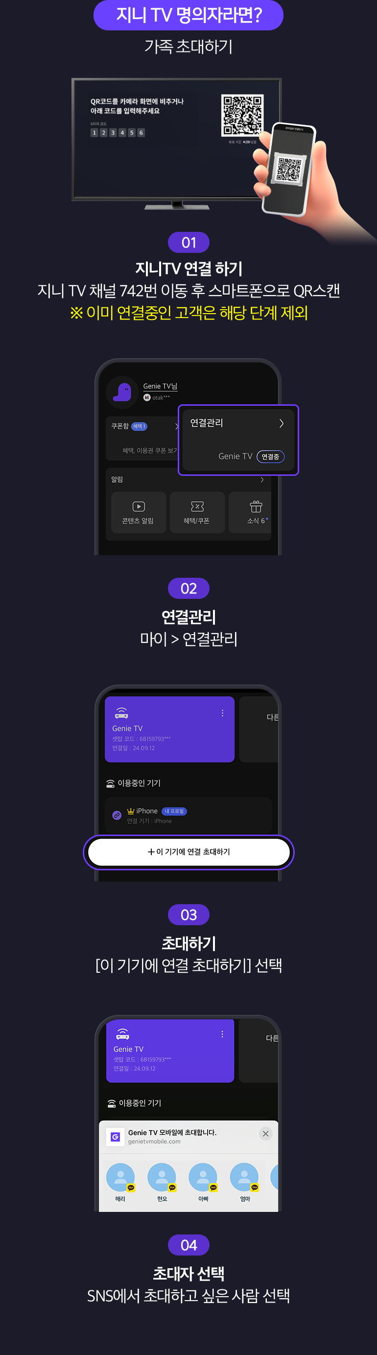 지니 TV 명의자라면?. 가족 초대하기. 01. 지니TV 연결 하기 지니 TV 채널 742번 이동 후 스마트폰으로 QR스캔 ※ 이미 연결중인 고객은 해당 단계 제외. 02. 연결관리 마이 > 연결관리. 03. 초대하기 [이 기기에 연결 초대하기] 선택. 04. 초대자 선택 SNS에서 초대하고 싶은 사람 선택.